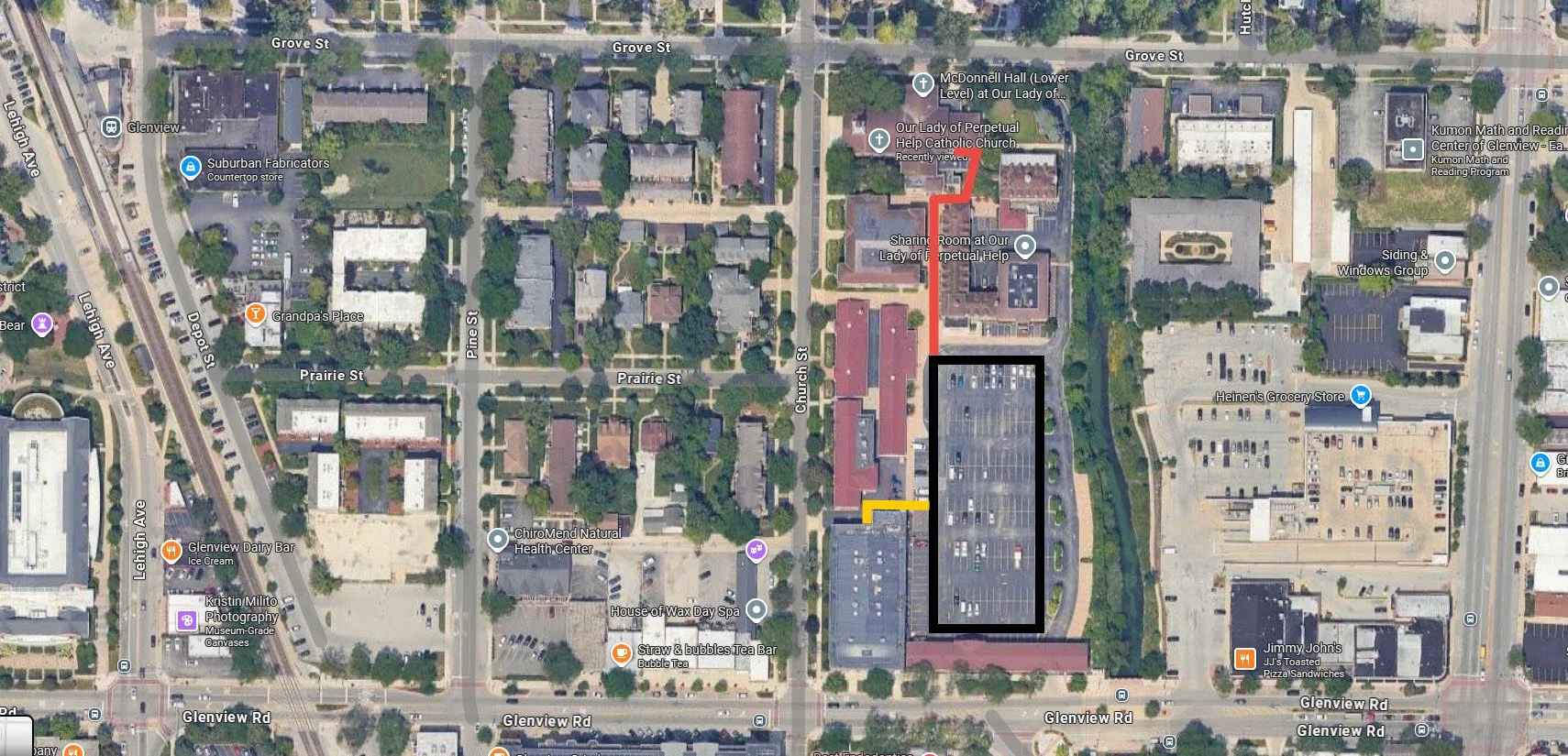OLPH is a big place and finding the scout room the first time can be a bit daunting. You can get to OLPH from Glenview Rd and park in main parking lot (black). Follow the sidewalk to the North (red) until you reach a stairway heading down. On nights when we meet at the pool or gymnasium you’ll find the door just behind the playground on the west side of the parking lot (yellow).